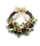 Wianek 30 cm świąteczny na obręczy z gałązek brzozy ze złotymi bombkami, szyszkami i kokardą