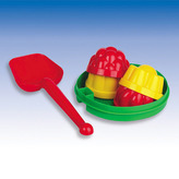 Sada na písek plast lopatka, hrabičky, 4ks bábovky v síťce