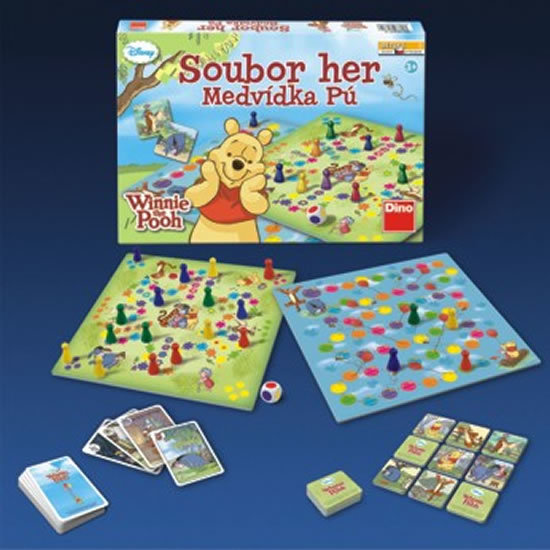 Soubor 4 her s ilustracemi Medvídka Pú a jeho přátel obsahuje 2 hry s obrázkovou kostkou a je tak vhodný pro děti od 3 let. Obsah:1 oboustranný herní plán,1 šestibarevná hrací kostka,24 figurek v 6 barvách,25 karet Černého Petra,48 kartiček Pexesa,1 návod przeczytaj całość