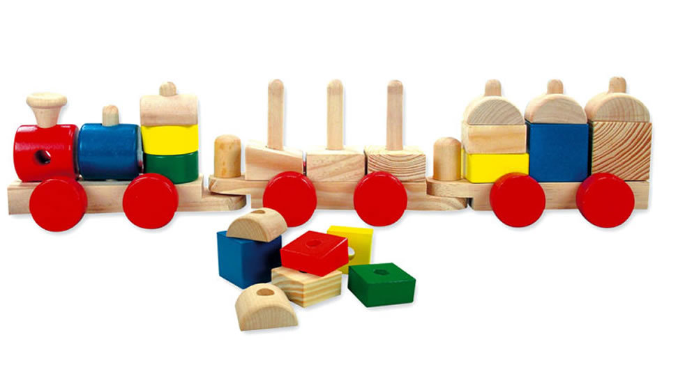 Barevný, dřevěný vláček - mašinka a dva vagónky, vše plné barevných dřevěných kostiček, které lze použít jako samostatnou stavebnici nebo je navlékat na tyčky. przeczytaj całość