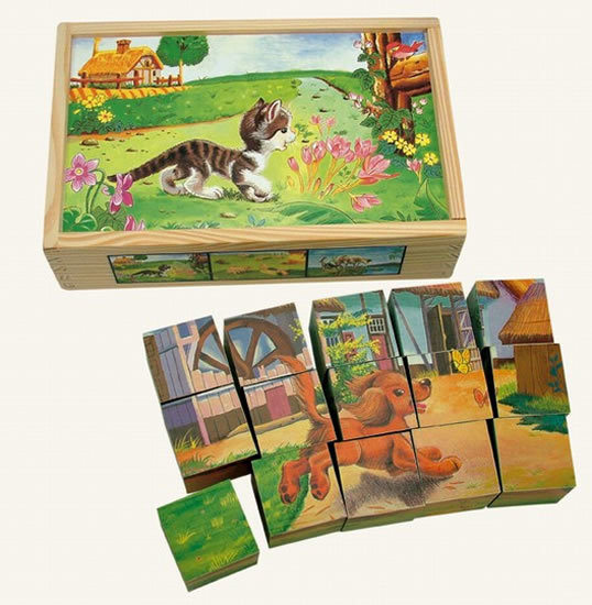 Nie ma nic lepszego niż klasyczna zabawka, obrazkowe kostki. Nadruki przedstawiające sceny z życia na wsi z domowymi i gospodarskimi zwierzętami. Kostki wykonane są z litego drewna i zapakowane w praktyczne pudełko ze sklejki.   Główne cechy:pudełko z pokrywką i 15 kostek6 różnych... przeczytaj całość