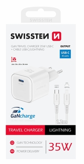 SWISSTEN SÍŤOVÝ ADAPTÉR GaN 1x USB-C 35W POWER DELIVERY BÍLÝ + DATOVÝ KABEL USB-C/LIGHTNING 1,2 M BÍLÝ