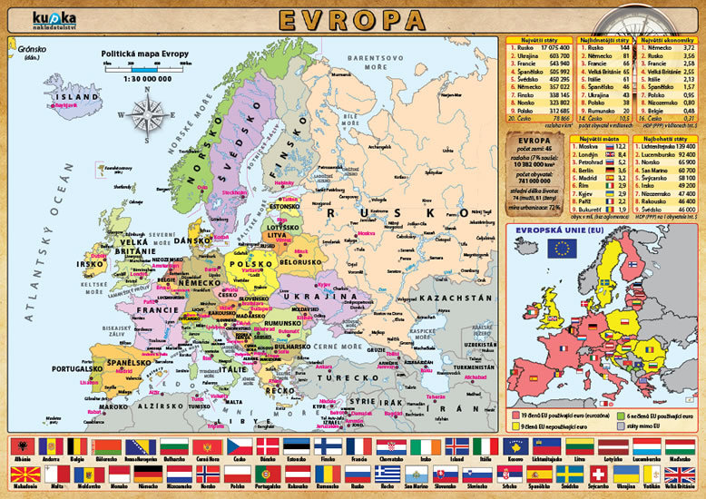 Polityczna i fizyczna mapa Europy wraz z mapą Unii Europejskiej. Zawiera flagi państw europejskich, tabele z rankingiem państw według różnych kryteriów oraz tabelę rekordów geograficznych. przeczytaj całość