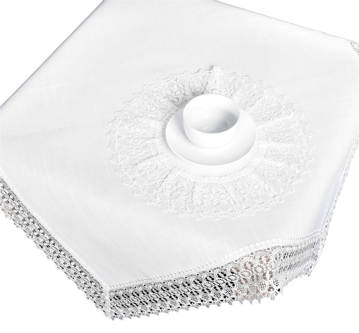 Nádherný dekorační ubrus s elegantní krajkou dokonale působí na prostřeném stole.Materiál: 100 % polyesterBarva materiálu: bíláBarva výšivky a krajky: bíláCYB 23 przeczytaj całość