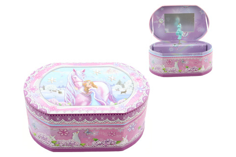 Muzyczna szkatułka na biżuterię w kształcie skrzyni. Wewnątrz szkatułki znajduje się lusterko i jednorożec, który po nakręceniu kluczyka tańczy i gra. Wymiary ok. 17 x 11 x 8 cm. Zapakowane w woreczek foliowy. Produkt nie jest zabawką. przeczytaj całość
