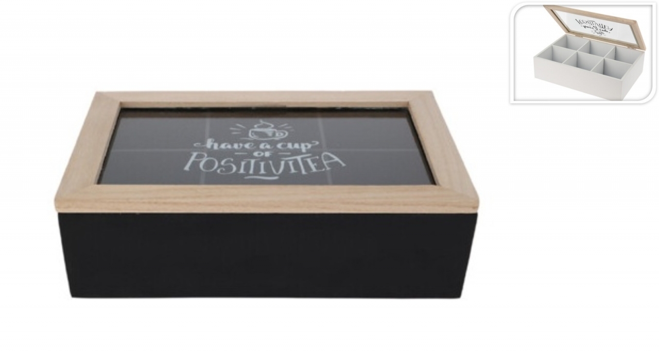 Drewniane pudełko na herbatę jest prawdziwym wyborem dla wszystkich, którzy nie wyobrażają sobie poranka bez filiżanki pysznej herbaty. Pudełko ma 6 przegródek i przezroczystą pokrywkę z napisem.