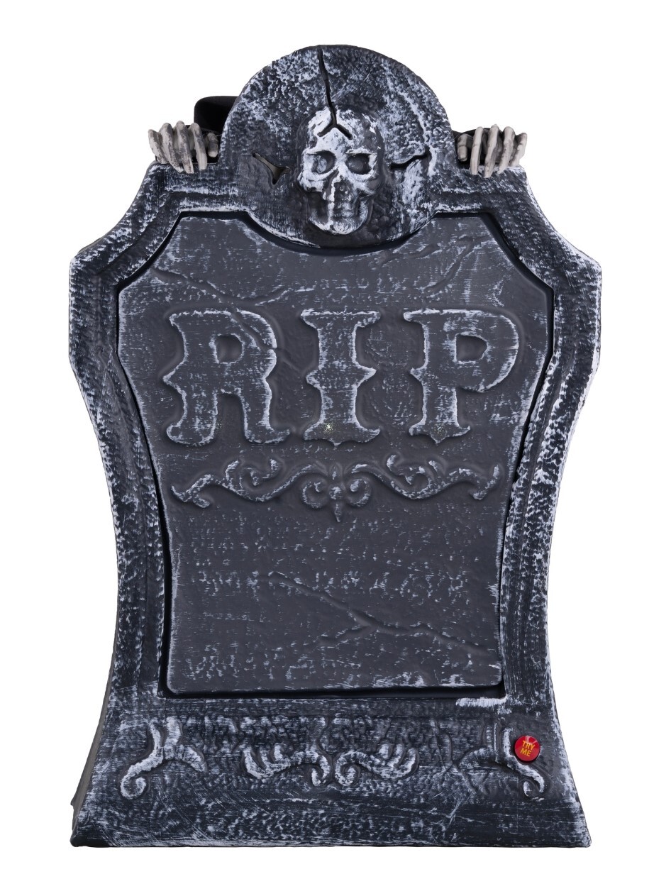 Hřbitovní náhrobní kámen vyroben z odolného pryskyřicového materiálu. Vybaveno LED světly, animovanou pohyblivou lebkou se svítícíma očima. Doplněno navíc o hlasový efekt. Ideální pro halloweenskou výzdobu venkovních dvoří, trávníku u domu. Pokud je spínač zapnutý, objeví se děsivá animovaná...