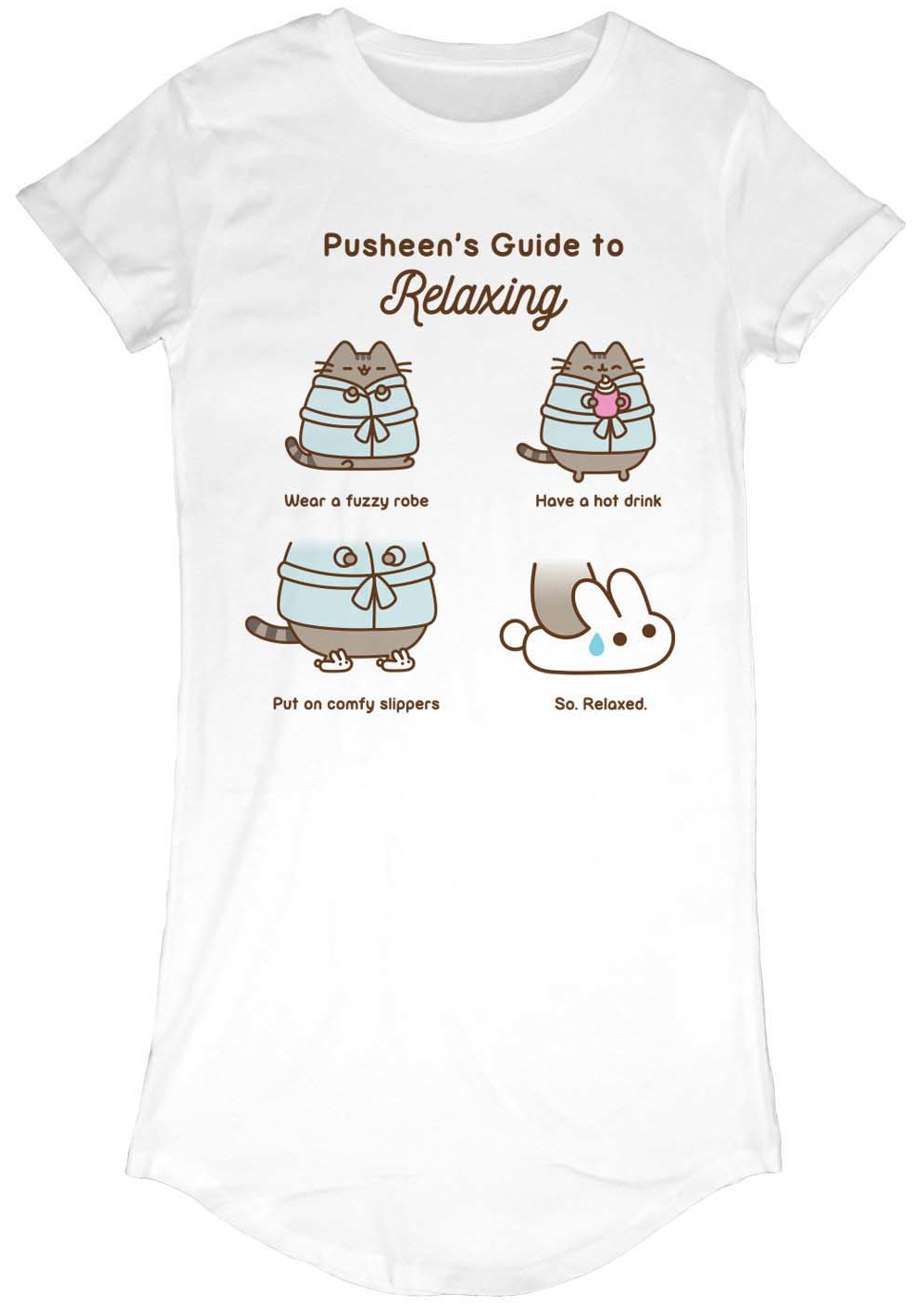 Bílé dámské tričko inspirované grafikou kočky jménem Pusheen a nápisem Pusheen's Guide to Relaxing.