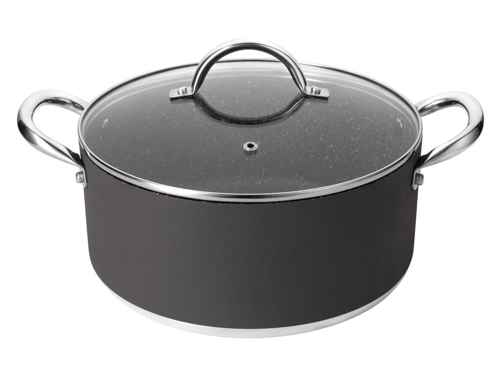 Hrnec 28cm, 6,3,2 vrstvý nepřilnavý povrch zesílený kamennou drtí, tvořící vzduchový polštář, díky kterému lze smažit v menším množství tuku; nerezové uchyty; vhodný na všechny typy varných desek včetně indukce; možnost použití v troubě při max. teplotě 130 °C; skleněná poklička przeczytaj całość
