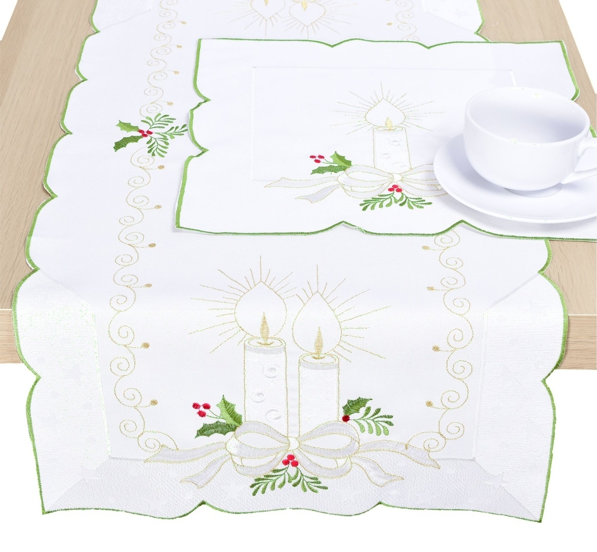 Exkluzivní dekorační vyšívaný ubrus přinese do vašeho domova kouzlo svátků a vytvoří tu pravou slavnostní atmosféru. Ubrusy jsou vyrobeny z kvalitní tkaniny, která dodává elegantní vzhled. Jemný motiv svíce a jmelí přidává nádech luxusu, zatímco zelený lem podtrhuje jeho sofistikovaný design....