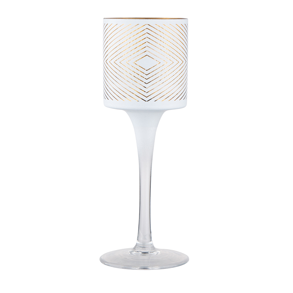 ŚKLENĚNÝ SVÍČNÍK BÍLÝ S ZLATOU VNITŘNOSTÍ NA NOŽCE 7X20CM DEKORACE GEOMETRICKÁ