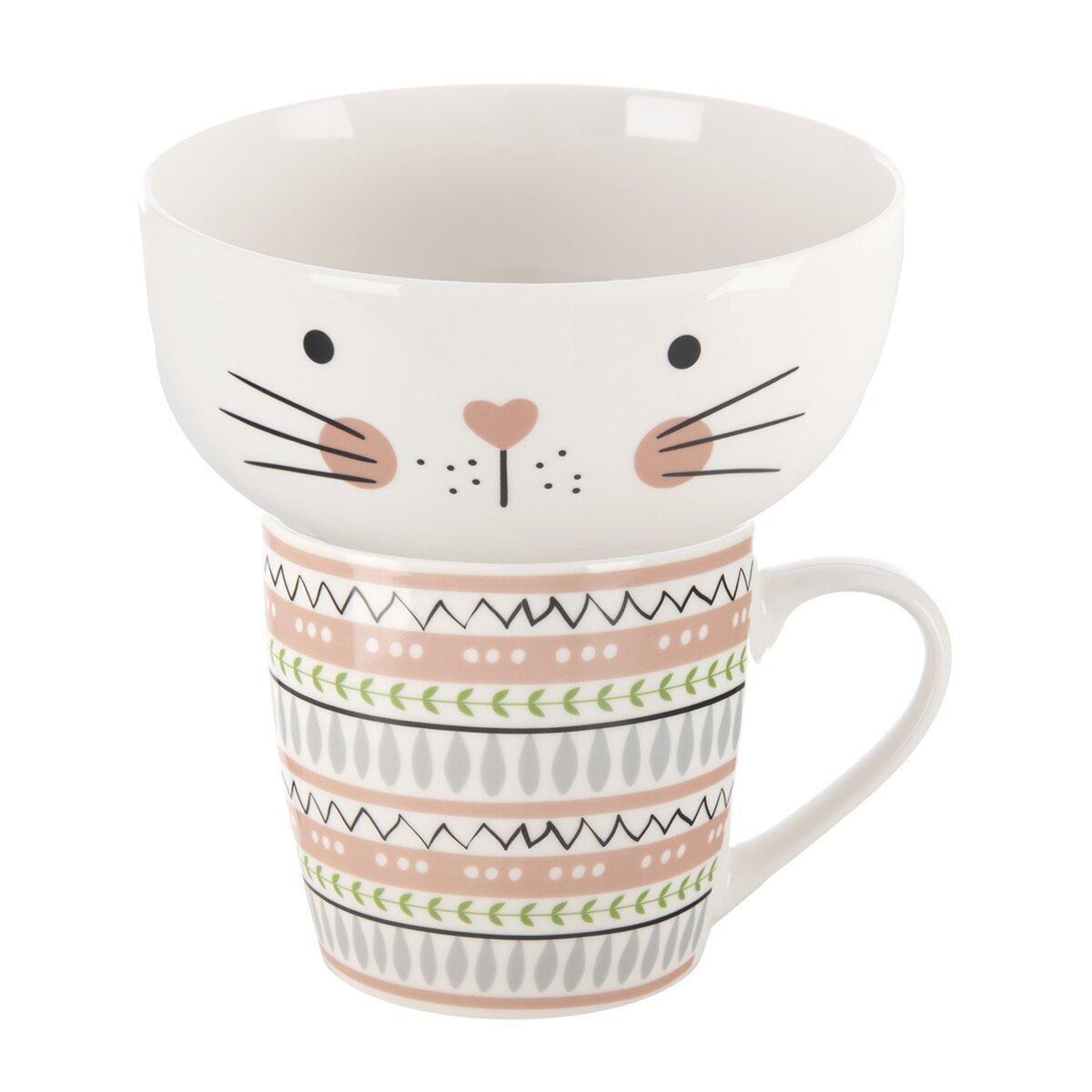 Porcelanowy kubek z dekoracją KOT jest uzupełniony miską, która jest częścią dekoru. Dopiero razem kubek i miska tworzą całość. To zabawne, figlarne i zainteresuje dzieci... Wykorzystasz jako zestaw śniadaniowy lub przekąskowy. Materiał: porcelana. Wymiary: kubek 350 ml, śr. 9 cm, wys. 8,5 cm, miska 600 ml, śr. 12,5 cm, wys. 6,5 cm. Można myć w zmywarce i używać w mikrofalówce. Dla dzieci od 3 lat.