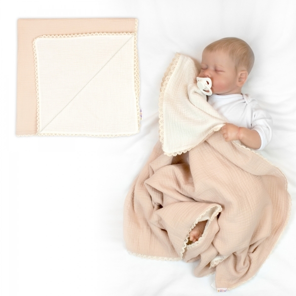 Luxusní mušelínová deka s krajkou Nature 80x80cm - béžová/smetanová