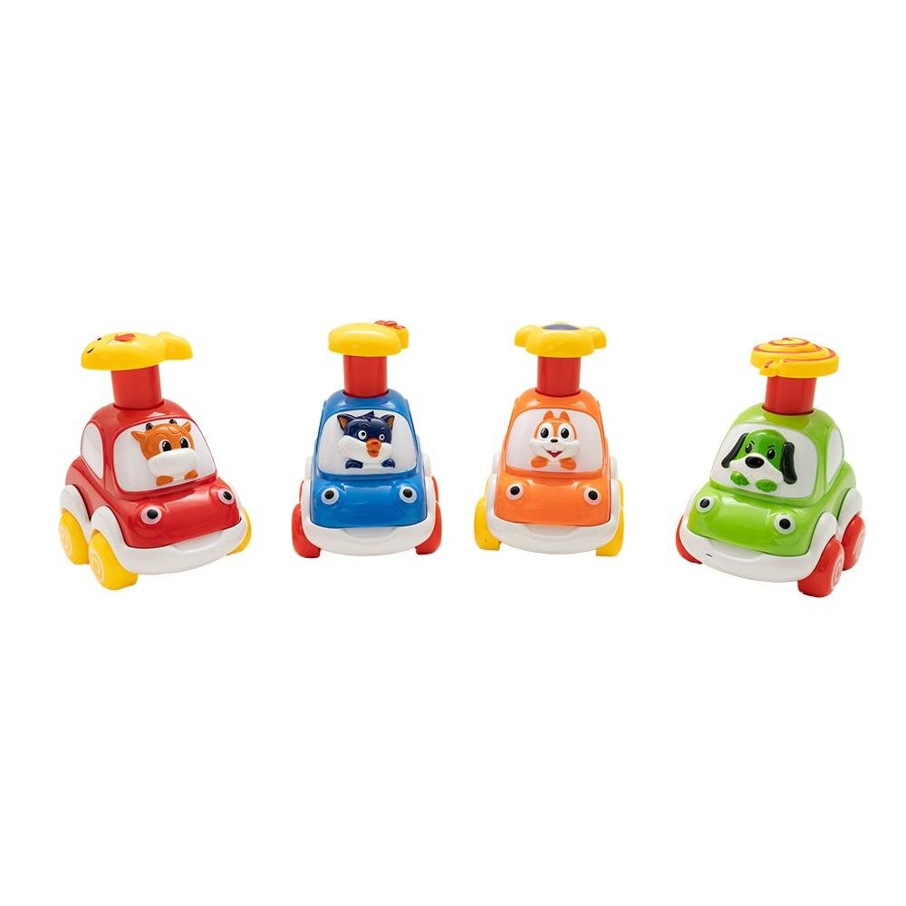 Kolorowe autko - wystarczy nacisnąć z góry wystający przycisk, a autko pojedzie do przodu. Autko pakowane w display'u po 8 sztuk. wymiary autka: 7 x 8 x 9 cm wymiary opakowania (display): 30 x 18 x 11.5 cm 4 wzory przeczytaj całość