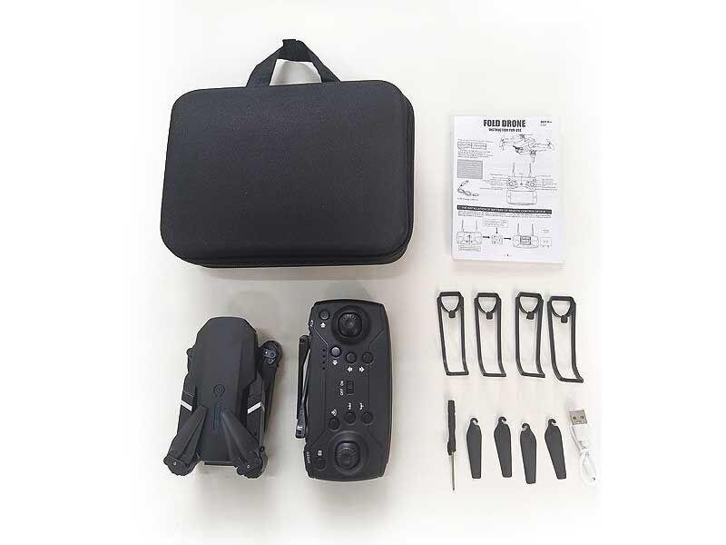 Dron z kamerąW zestawie: dron pilot pokrowiec kabel USB 5 zapasowych skrzydełek 4 blokady na skrzydełkaFunkcje: lata we wszystkich kierunkach robi zdjęcia i filmiki w czasie lotu zbliżanie ujęcia opcja kamery VR z widoku pierwszej osoby ustawianie trasy lotu przeczytaj całość