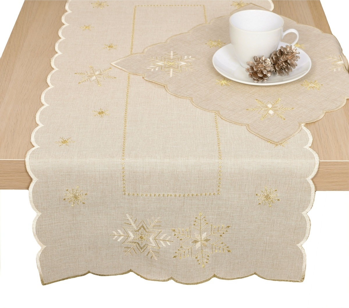 Exkluzivní dekorační vyšívaný ubrus přinese do vašeho domova kouzlo svátků a vytvoří tu pravou slavnostní atmosféru. Ubrusy jsou vyrobeny z kvalitní žíhané béžové tkaniny, která dodává přírodní a teplý vzhled. Jemný zlatě krémový motiv vloček přidává nádech luxusu a elegance, zatímco krémový lem...