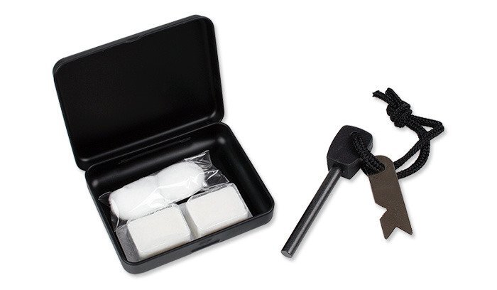 Zestaw do rozpalania ognia firmy Fosco Industries pozwalający na otrzymanie ognia bez użycia zapałek czy zapalniczki. Zawiera krzesiwo surwiwalowe, dwa kłębki waty oraz dwie kostki paliwa stałego. Całość zamknięta jest w mocnym, blaszanym pudełku koloru czarnego. Pocierając blaszką o pręt...