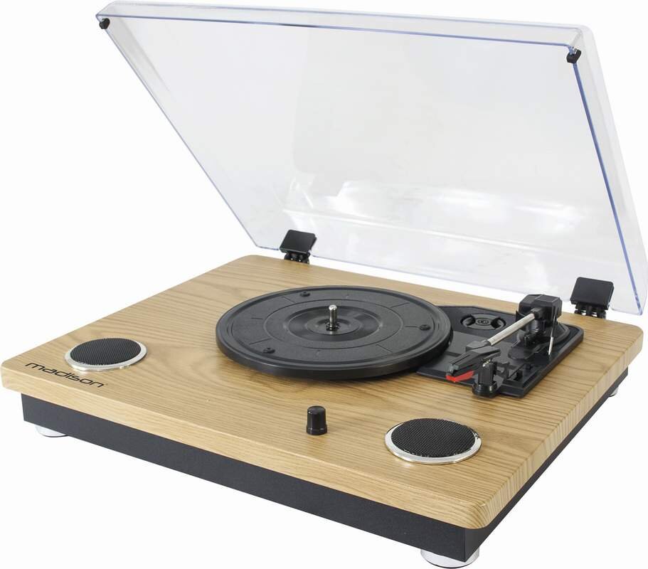 Vintage gramofon se zabudovanými reproduktory s regulací hlasitosti a USB/SD/MP3 přehrávačem s Bluetooth připojením. Výběr rychlosti přehrávání desek 33/45/78 rpm. Možnost nahrávání z desky do MP3 formátu na USB nebo SD. Výkon vestavěných reproduktorů 2x 8W. Řemenový pohon, keramická přenoska, linkový výstup, protiprachový kryt. Napájení 5V DC / 1A pomocí dodaného adaptéru.