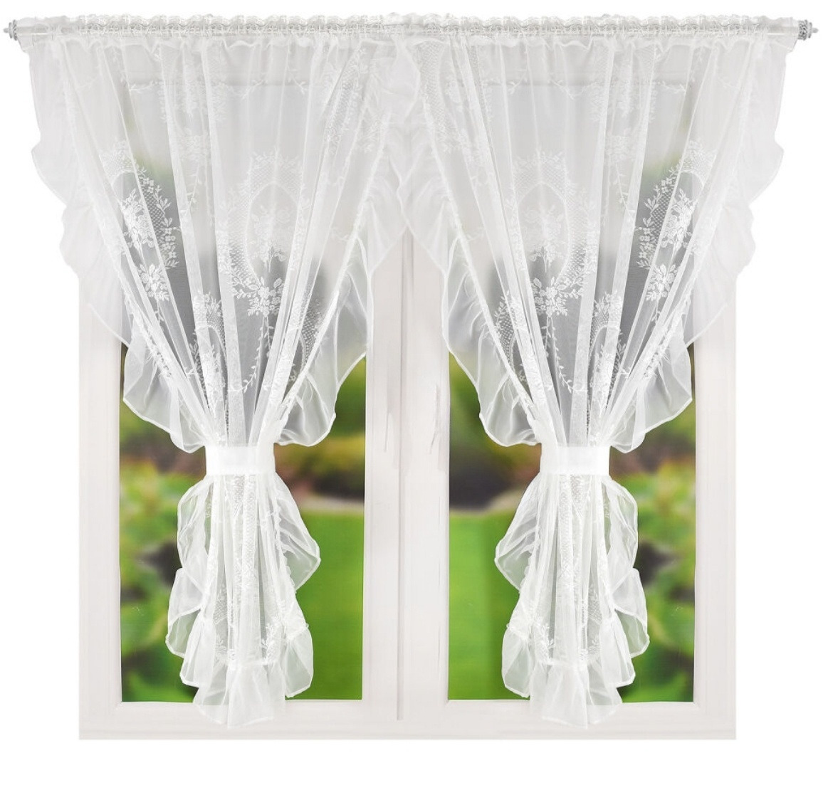 Kvalitní krátká hotová dekorační voálová záclona v rozměru 300x150 cm. Záclona má našitou řasící pásku s tunýlkem pro zavěšení na tenčí garnyž, žabky nebo háčky. 1 kus v balení. Okraje záclony zdobí jemný voálový volán. Zdobí ji jemný vzor. Součástí záclony jsou dvě stuhy k jejímu upevnění. CENA JE ZA PRAVÝ A LEVÝ ŠÁL.