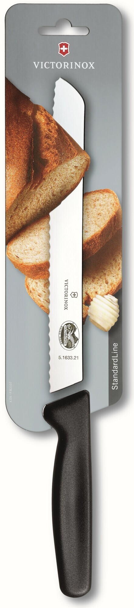 Nôž na chlieb a pečivo Victorinox 5.1633.21B Brad Knife vhodný na čerstvý, chrumkavý chlieb dokonca aj na krájanie narodeninovej torty.Má čepeľ so zúbkovanou hranou a rukoväť z čierneho polypropylénu. Vhodný do umývačky riadov.Balený v blistri. przeczytaj całość
