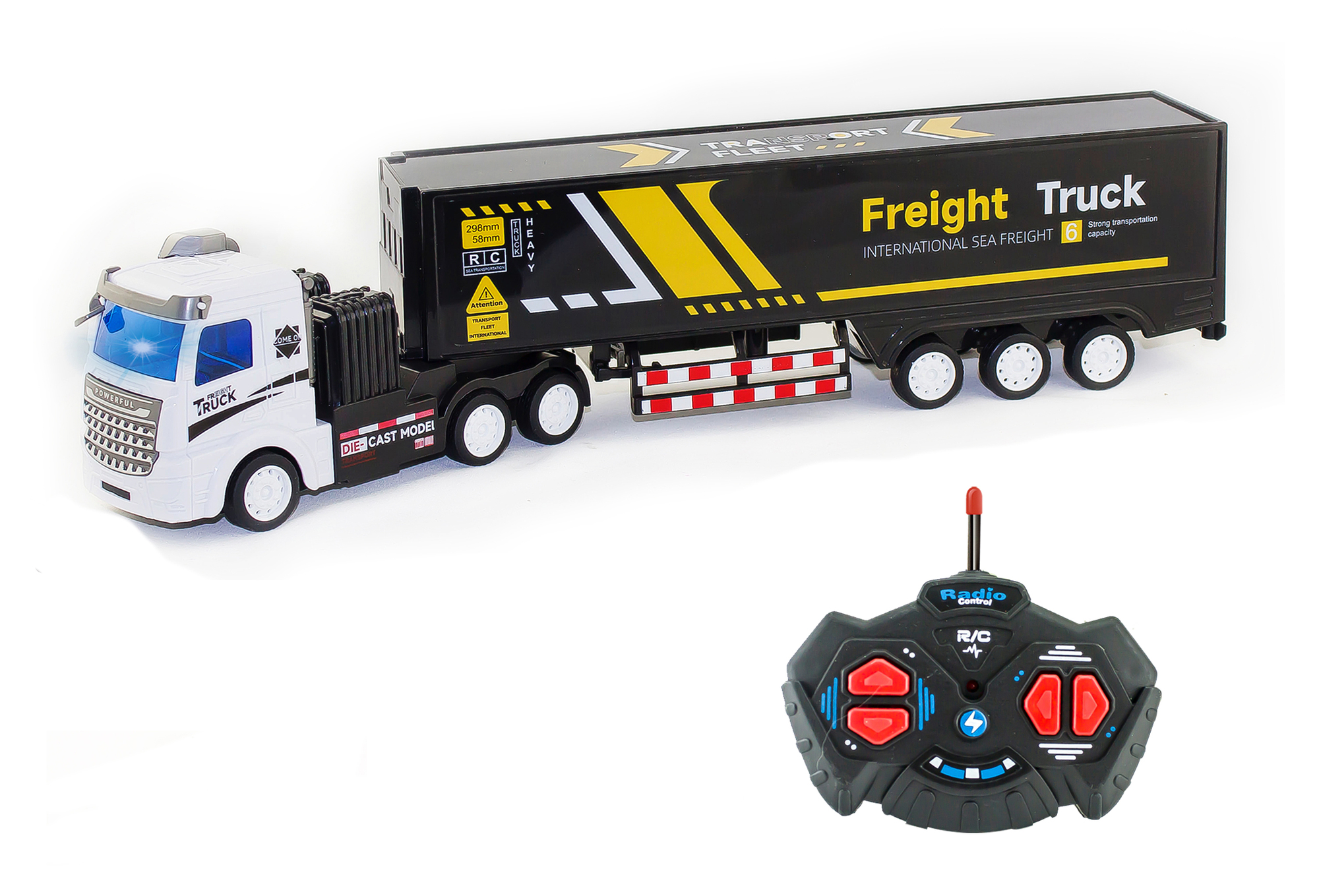 Ciężarówka RC zdalnie sterowana. Wymiary 41x11,5x6,5 cm. Częstotliwość 27 MHz. Efekty świetlne. Akumulator 3,7 V do ciężarówki w zestawie, 2x AA do pilota nie są w zestawie. Kabel USB w zestawie. Przełącznik ON/OFF znajduje się na spodniej stronie ciężarówki. przeczytaj całość