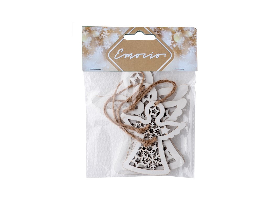 Závěs dřevo 3ks 105x120/85x95/70x80mm anděl uvnitř vločky, hvězdy, bílá