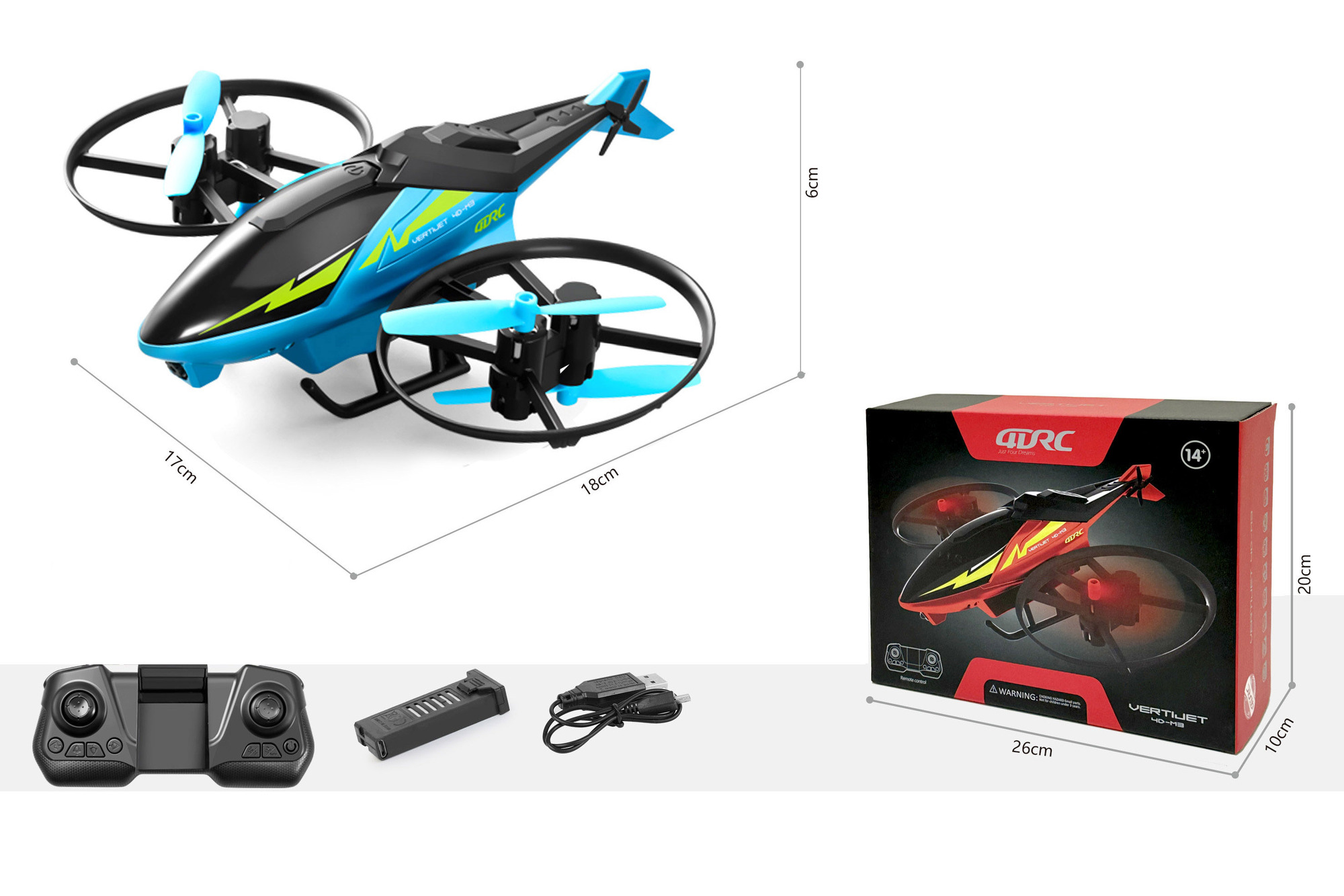 Vrtulník RC na dálkové ovládání. Bez kamery. Rozměry 18x17x6 cm. 3.7V 500mAh bateriový pack do vrtulníku součástí, 3xAAA do ovladače nejsou součástí. USB kabel součástí. Provoz 6 min, nabíjení 90 min, dosah ovladače 80-100 m. Funkce - pohyb na místě, obrat o 360 stupňů, návrat do výchozí polohy. Tlačítko ON/OFF na vrtulníku a na ovladači.