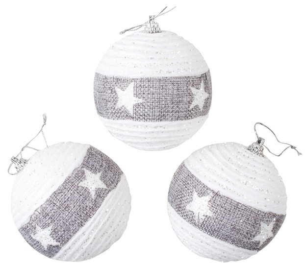 Baňky bílé s hvězdou a šedým pruhem 8 cm, 3 ks