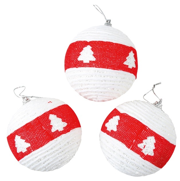 Baňky bílé se stromkem a červeným pruhem 8 cm, 3 ks