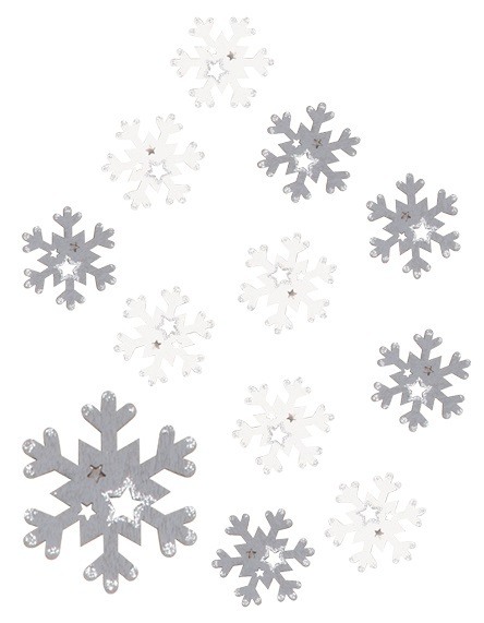 Vločka dřevěná s lepíkem 4 cm šedá a bílá, 12 ks