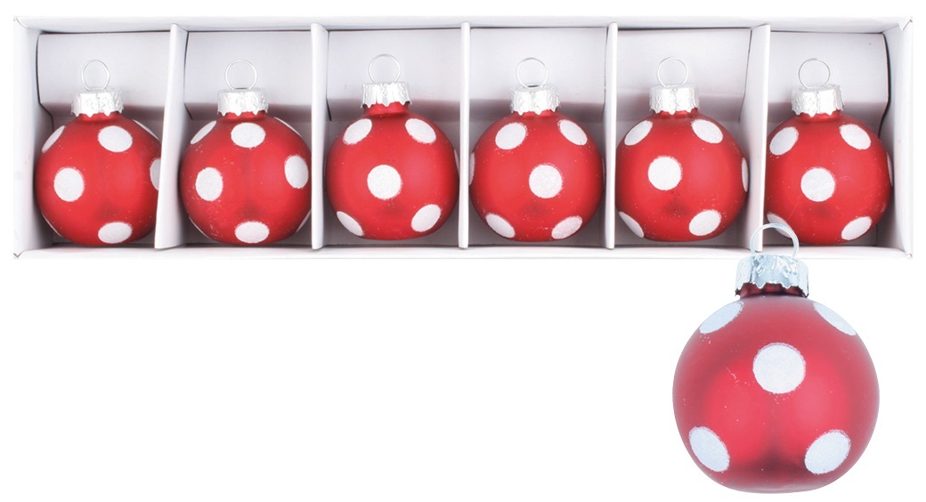 Pudełko zawiera 6 sztuk czerwonych bombek z białymi kropeczkami.