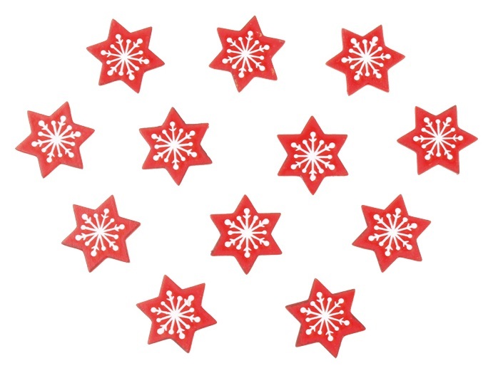 Hvězdy dřevěné s vločkou a lepíkem 3 cm, 36 ks, červené