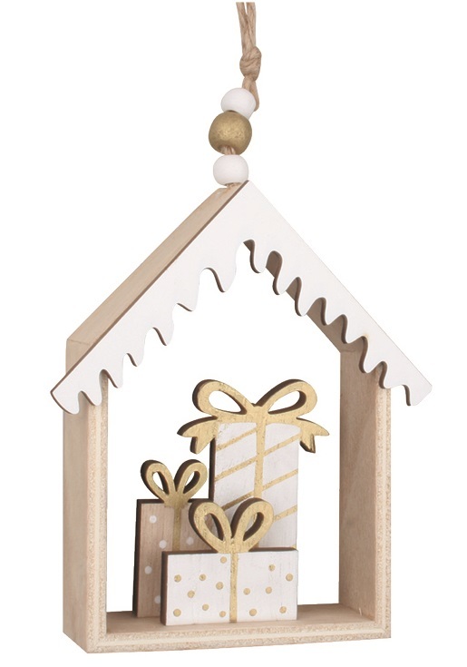 Dřevěná dekorace domeček s dárky na zavěšení 9,5 x 11 x 2,5 cm