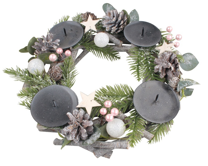 Adventní svícen věnec s růžovými kuličkami 30 cm