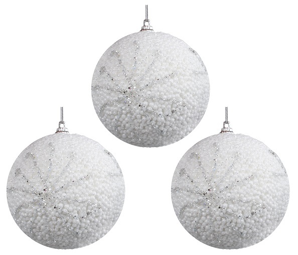 Baňky bílé s glitrovými vločkami 8 cm, 3 ks