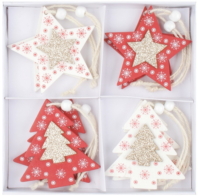 Dřevěné dekorace s glitry na zavěšení 8 cm, 8 ks v krabičce