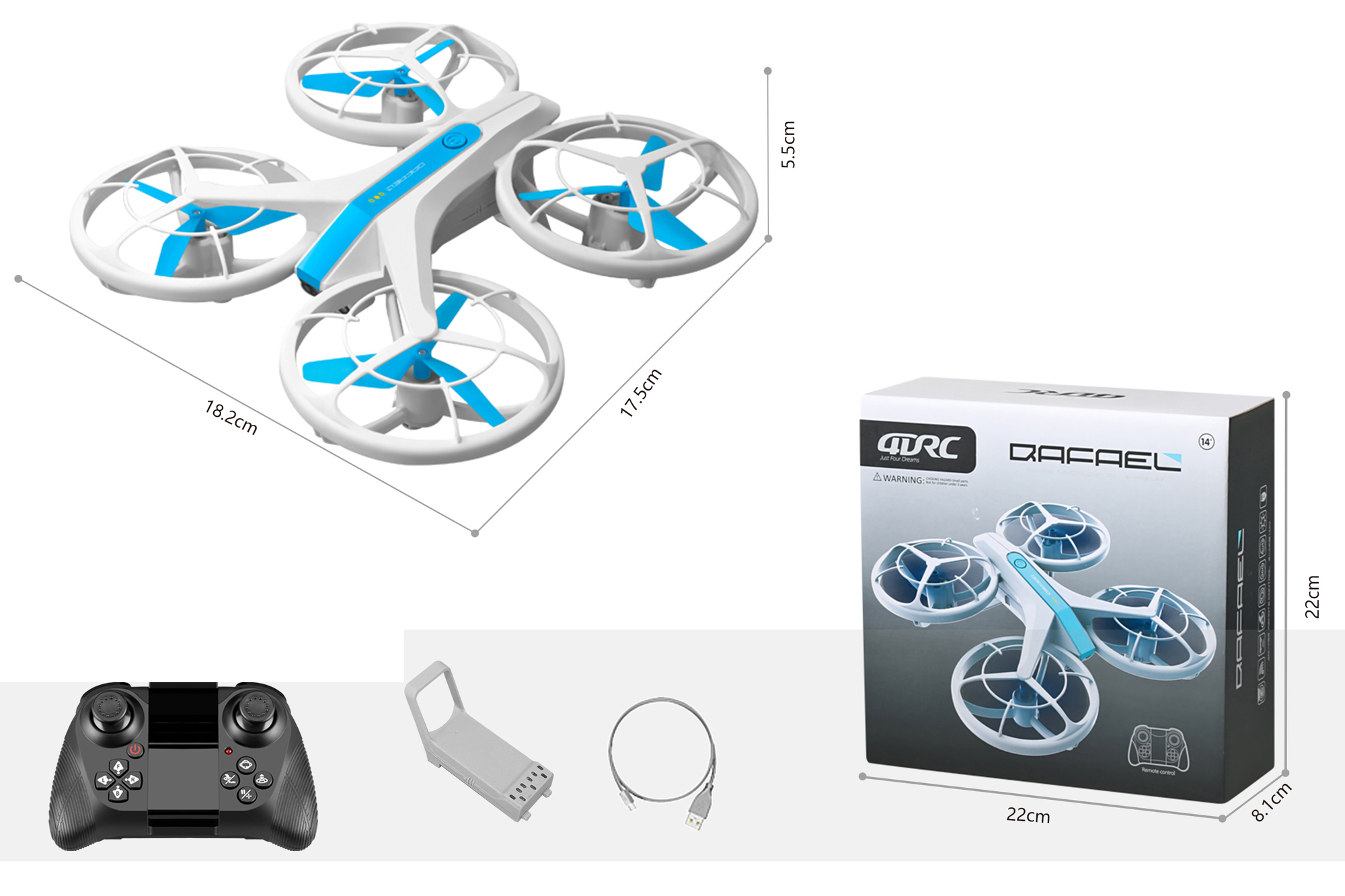 Dron Qafael RC na dálkové ovládání. Bez kamery. Rozměry 18x17,5x5,5 cm. 3.7V 550mAh bateriový pack do dronu součástí, 3xAAA do ovladače nejsou součástí. USB kabel součástí. Provoz 6 min, nabíjení 90 min, dosah ovladače 60 m. Funkce - pohyb na místě, obrat o 360 stupňů, návrat do výchozí polohy.... przeczytaj całość