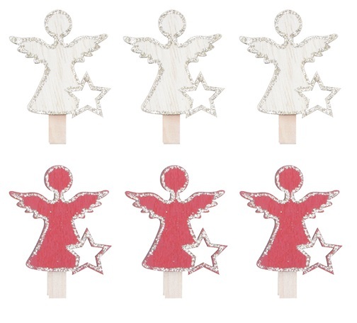 Anděl dřevěný na kolíčku 4 cm červený a přírodní, 6 ks