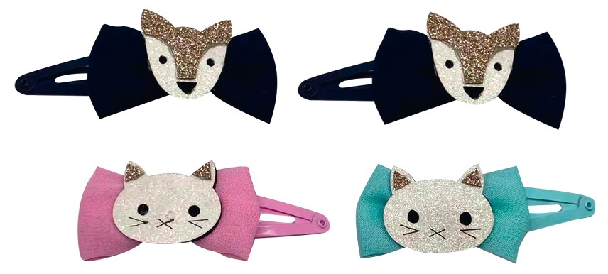Spinki z kokardką i motywem kotka i liska ładnie ozdobią każdą fryzurę.