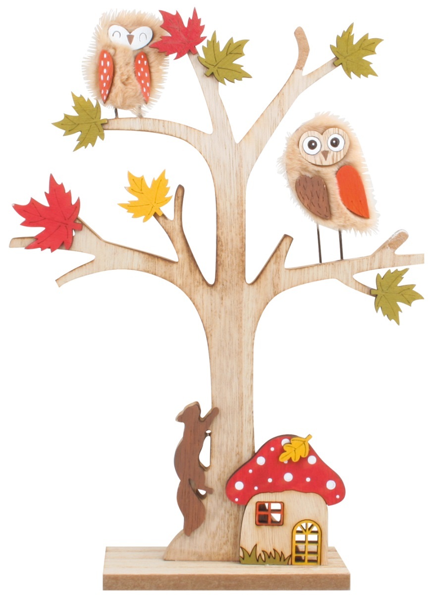 Dřevěný strom se sovami a domečkem 30 cm