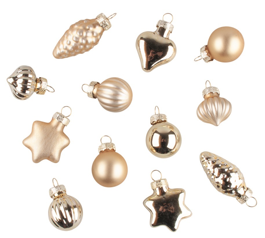Pudełko zawiera 12 sztuk bombek o różnych kształtach i wzorach.