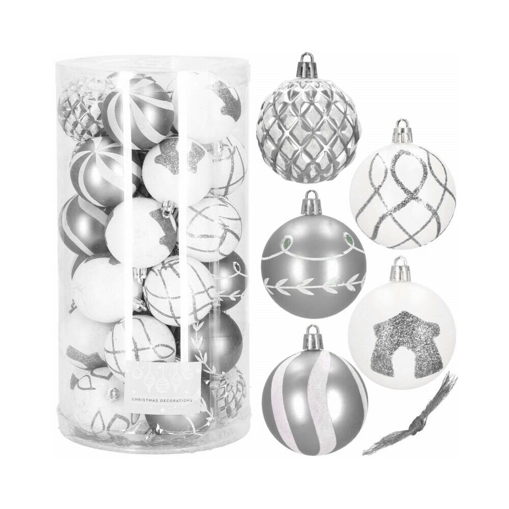 Vánoční baňky bílo-stříbrné mix - 6 cm, sada 30ks