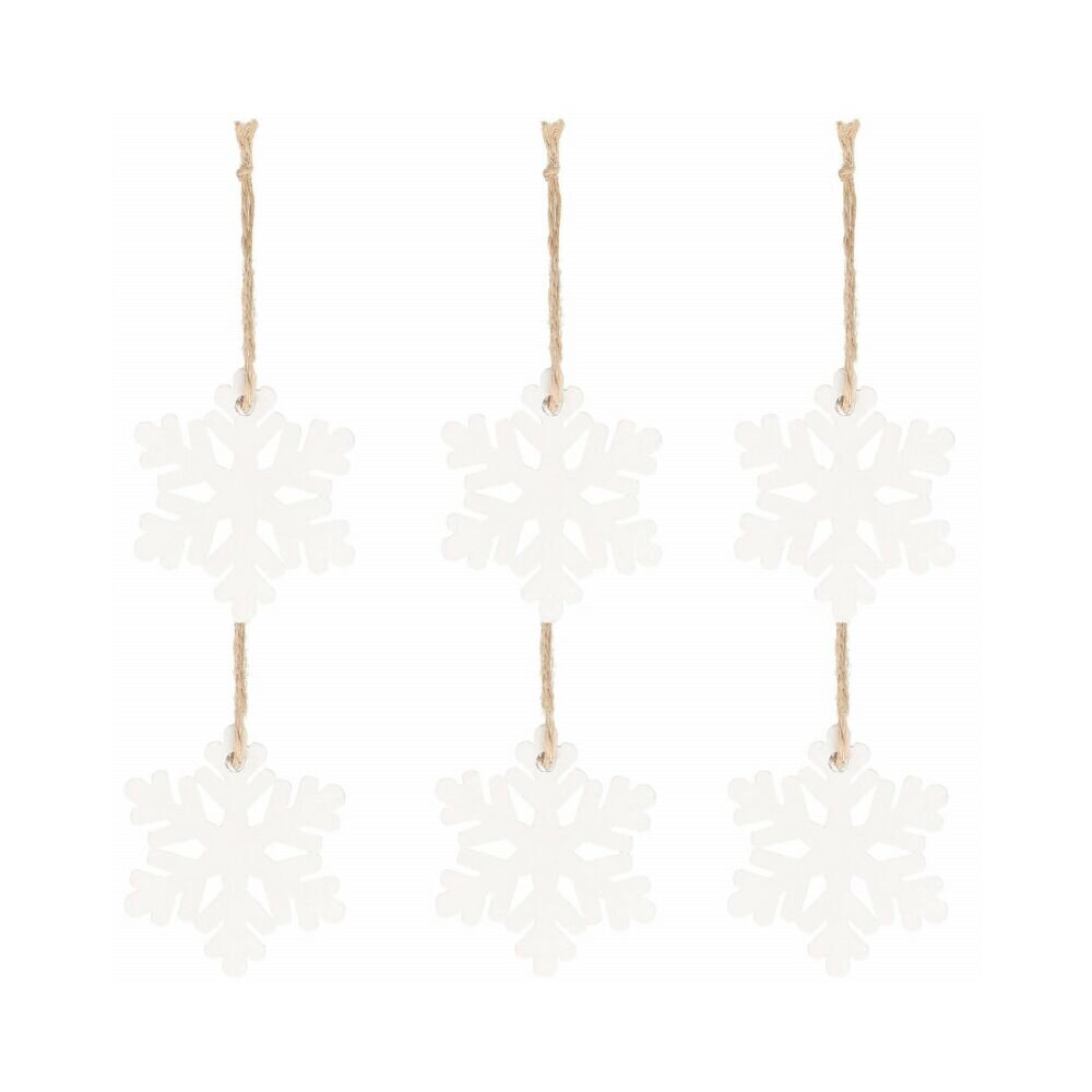 Sada 6ks dřevěných ozdob s provázkem na zavěšení. Vzor sněhové vločky, bílá barva, výška 4 cm, přírodní materiál, krásné zdobení. Ideální k výzdobě stromečků nebo jako vánoční dekorace. przeczytaj całość