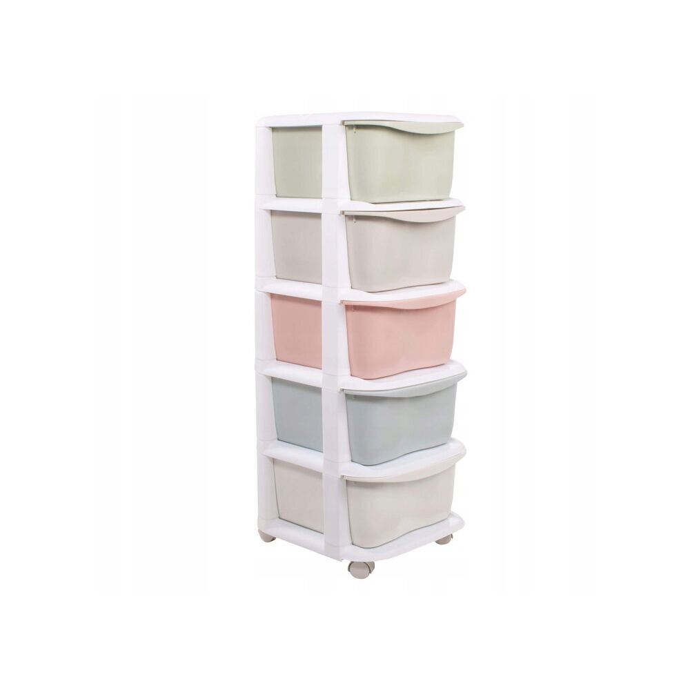 Pojízdná skříňka na kolečkách s pěti prostornými zásuvkami. Vhodná do dětského pokoje na hračky, do koupelny nebo jako botník do předsíně. Ochrana proti vypadnutí, pohodlné rukojeti kvalitní materiál, pastelové barvy, snadno se čistí. Rozměry 37x37x100 cm (ŠxHxV). przeczytaj całość
