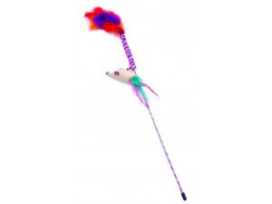 Škádlítko s barevnými pírky, pružným provázkem a myškou s pírky. Rozměry: Tyčka 45cm, provázek 45cm, myška 7cm przeczytaj całość