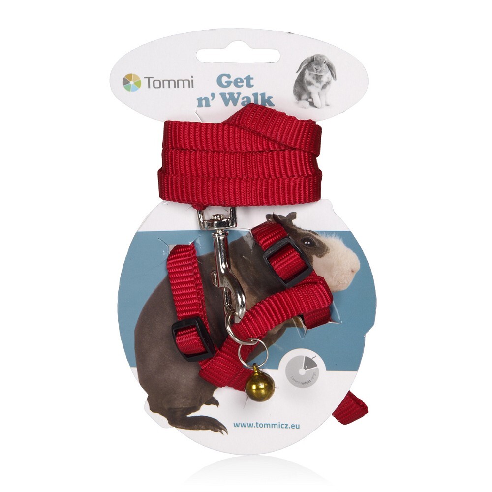 Nylonowe szelki w rozmiarze dla świnek morskich z plastikowymi klamrami do zapinania i z dzwoneczkiem. Smycz: 120 cm Szelki: 15/25 cm Kolor: niebieski, zielony, czarny, czerwony przeczytaj całość