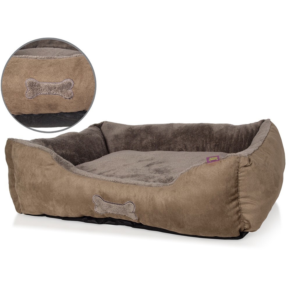 Textilní pelíšek pro psy• kombinace semiše a plyše v hnědé barvě• nášivka s motivem kosti na přední straněRozměry: 75x65x22cm przeczytaj całość