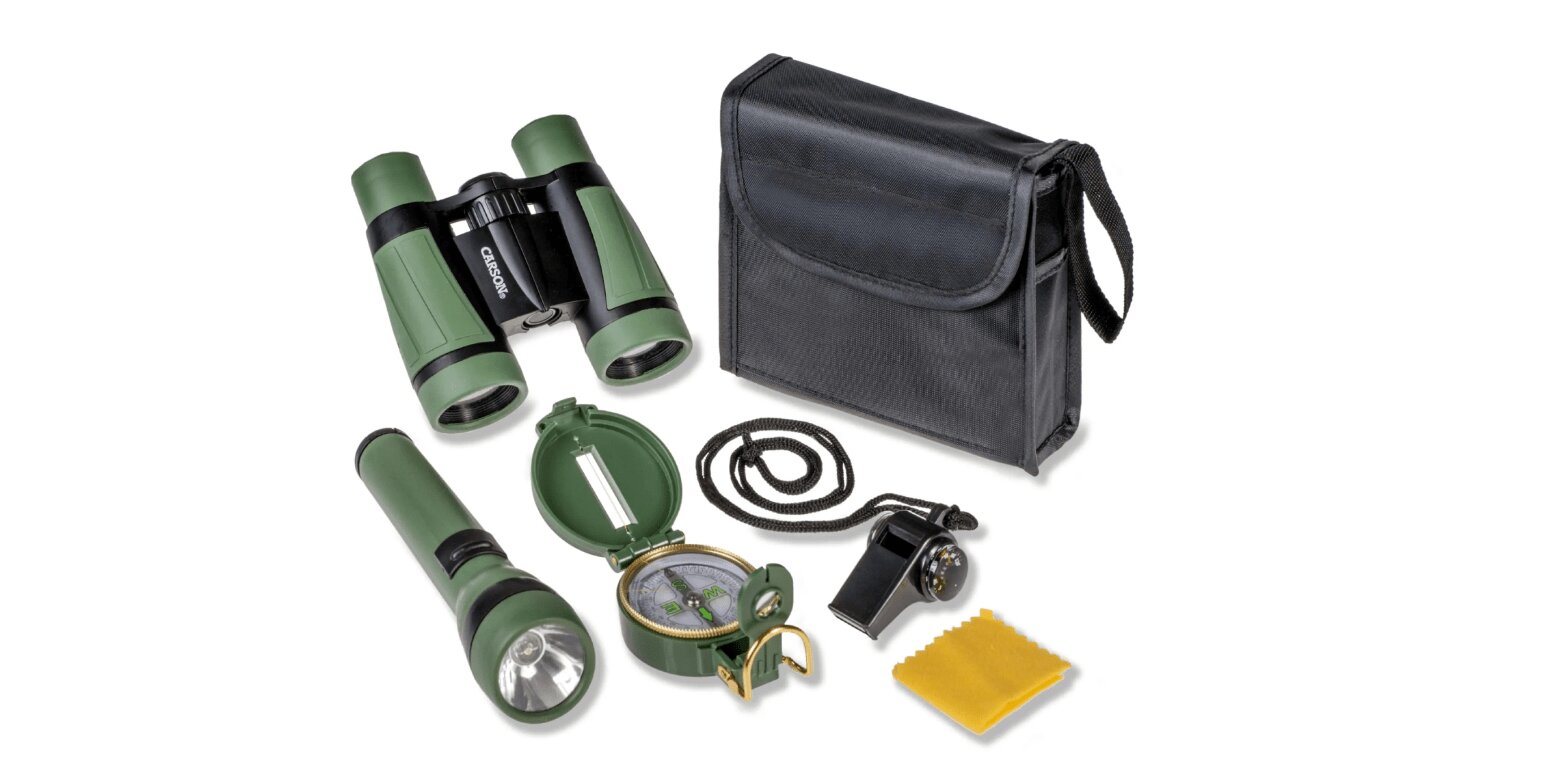 Zestaw Carson HU-401 Kid's Outdoor Adventure Set dla małych odkrywców i zawiera lornetkę, kompas, latarkę, gwizdek oraz etui z paskiem i ściereczkę do wycierania.