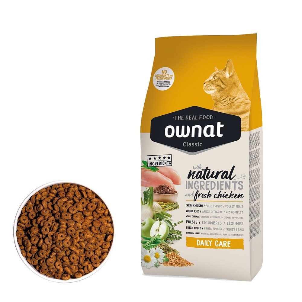 OWNAT CLASSIC CAT Pielęgnacja codzienna to kompletna karma przeznaczona do codziennego żywienia dorosłych kotów. Karma została zaprojektowana tak, aby dostarczać wszystkie niezbędne składniki odżywcze, których koty potrzebują, by zachować zdrowie i witalność. Zawiera wysokiej jakości białka z mięsa kurczaka, które wspierają mięśnie, oraz zdrowe węglowodany z ryżu, które dostarczają energii i wspomagają prawidłowe trawienie.