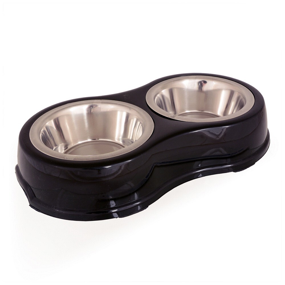 Dvě nerezové misky v černém plastovém stojanu, které lze nezávisle na sobě snadno vyjmout, a které lze omýt. •  Doplněno o protiskluzové, pryžové nožičky•  Možno mýt v myčceParametry: •  Objem: 2 x 0,4l•  Vnější průměr misky: 13,5cm•  Vnitřní průměr misky: 11cm•  Výška misky: 5cm•  Délka... przeczytaj całość
